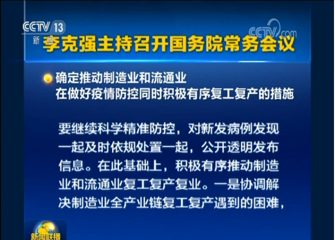 李克強(qiáng)主持召開(kāi)國(guó)務(wù)院常務(wù)會(huì)議 積極有序推動(dòng)制造業(yè)和流通業(yè)復(fù)工復(fù)產(chǎn)復(fù)業(yè)